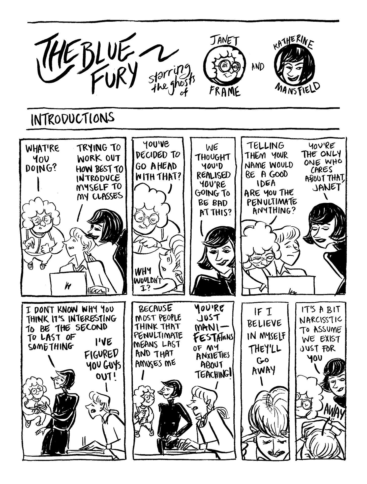 IntroductionsA Blue Fury comic stripTara BlackJan 25, 202661ShareThe Blue Fury is a comic about the ghosts of Janet Frame and Katherine Mansfield haunting a first-year English teacher.Thanks for reading Tara Comics! Feel free to like and share.SubscribePreviousNext